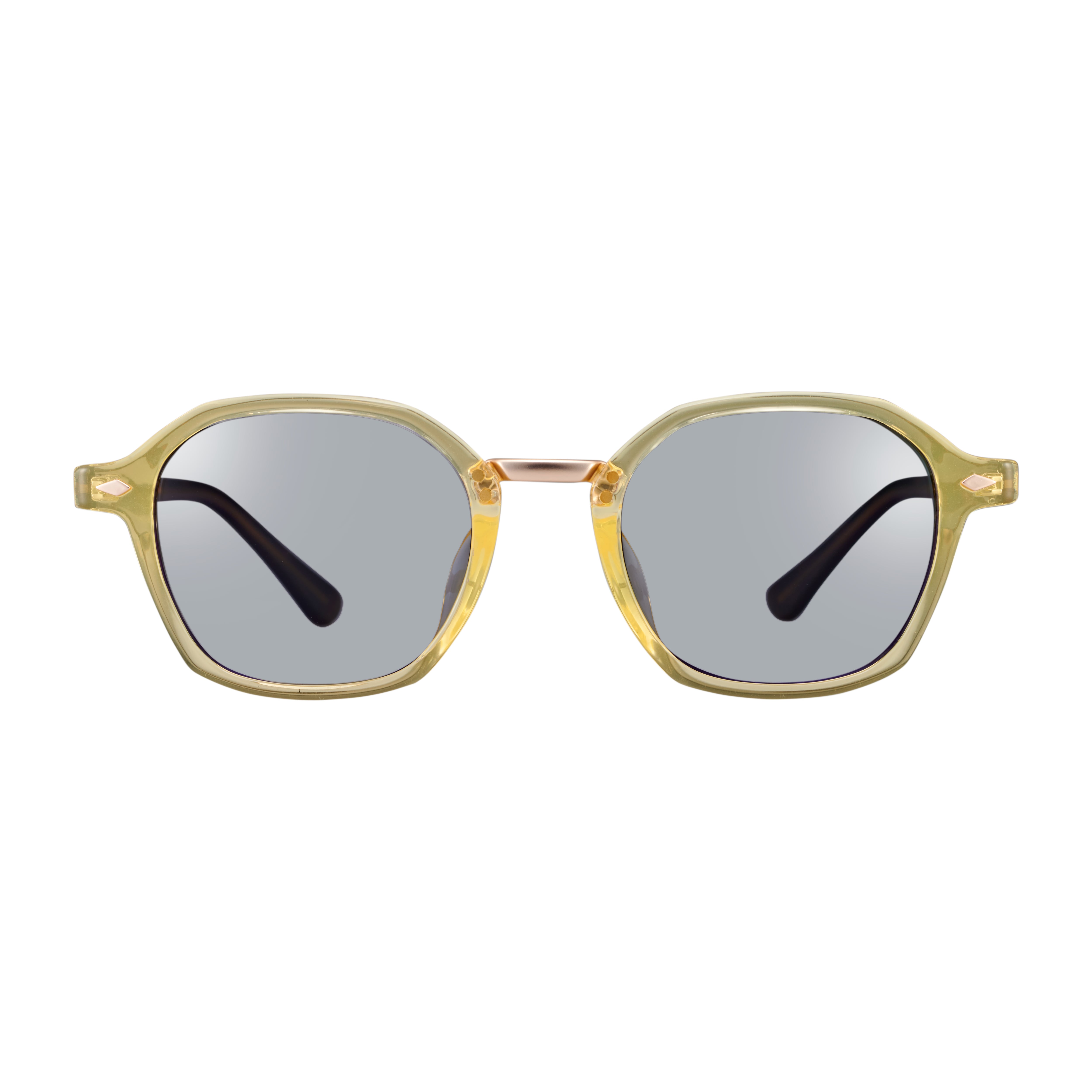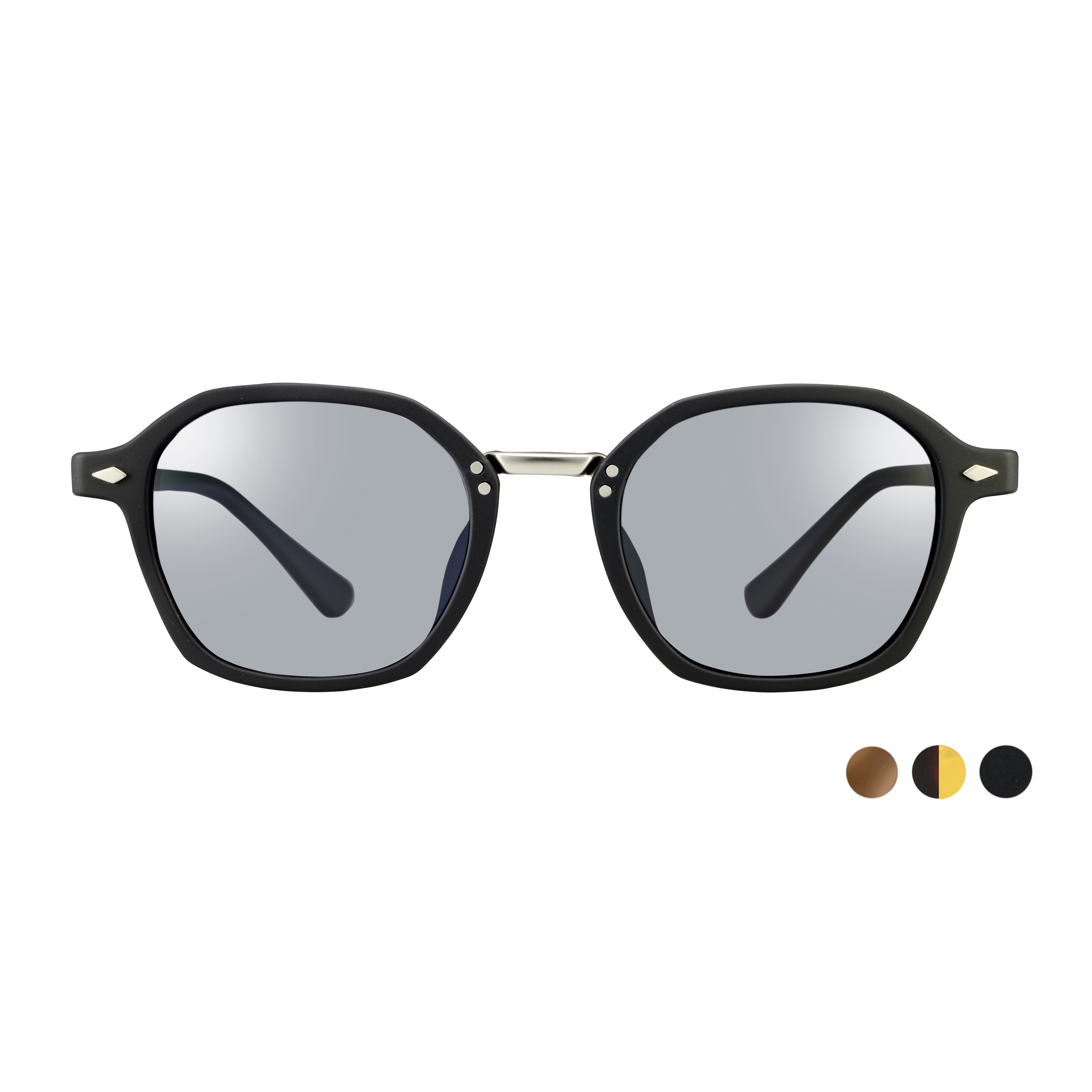 程よいボリュームを持たせたセルフレームに、フロント両サイドの「ダイヤ型リベット」がアクセントを添えるコンビネーションフレーム。